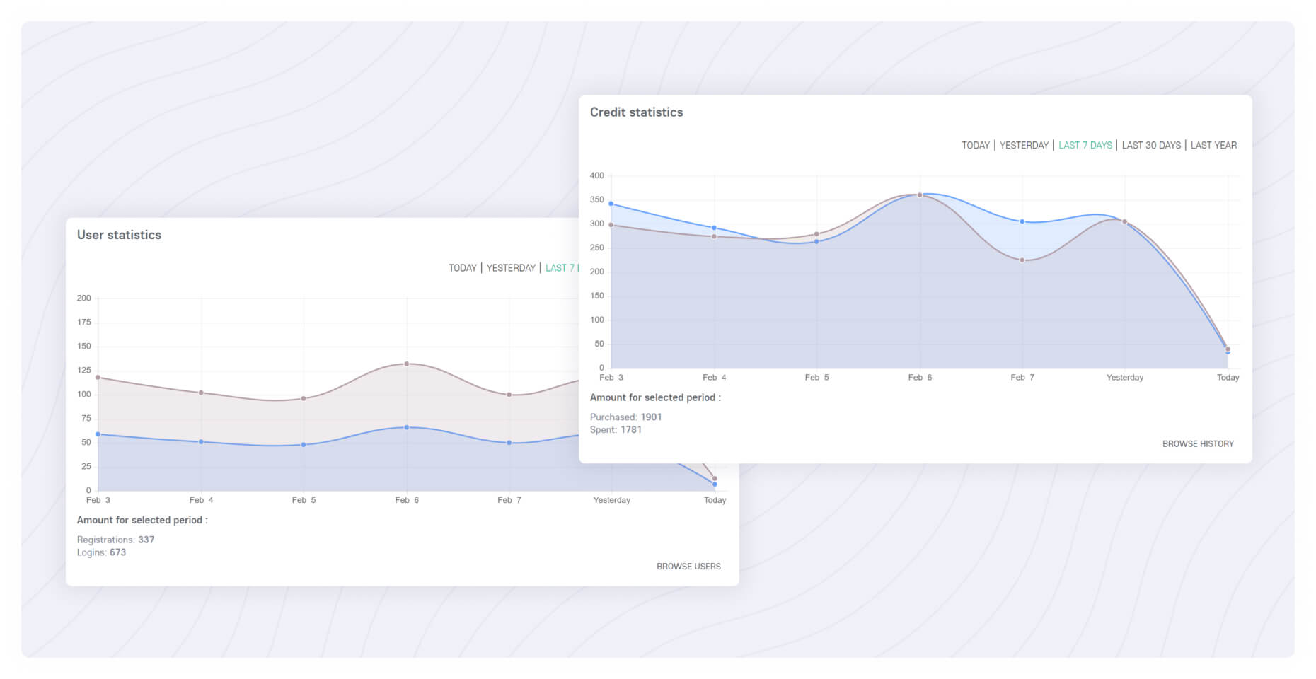 Keep track of the main Website's statistics, like the number of new registrations and the number of new logins. Check how many credits were purchased and spent during the specific time period.